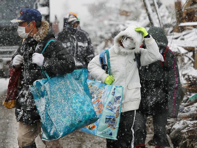 Obdachlos nach Erdbeben und Tsunami und hilflos der Kälte ausgesetzt: Straßenszene in Natori.