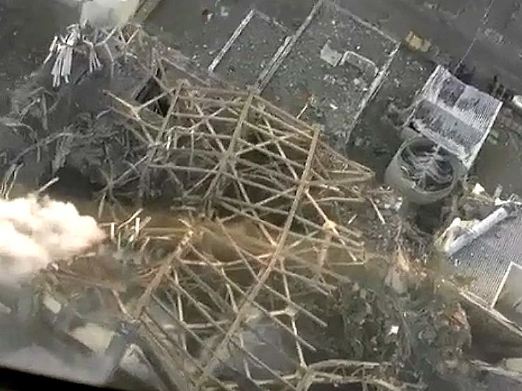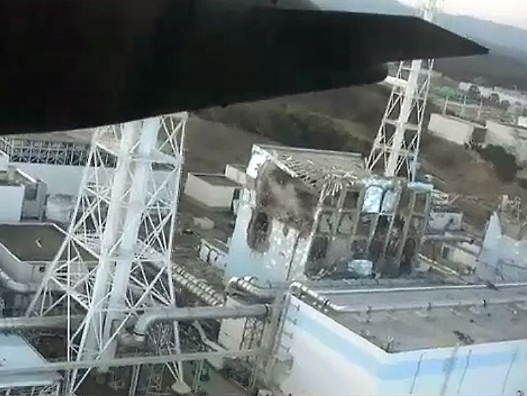 Zu sehen sind die völlig zerstörten Reaktoren der Atomanlage. Von den einst hellblauen Gebäuden sind nur noch Trümmer, verbogene Stahlträger und Steine zu sehen. Die Bilder lassen erahnen, wie gewaltig die Explosionen im Inneren waren. An mehreren Stellen steigen Rauch und Dampf aus den Trümmern. Der Hubschrauber fliegt offenbar von Norden die Reihe der Kraftwerksblöcke entlang. Zuerst sind die unversehrten Meiler 5 und 6 zu sehen. Danach überfliegt der Hubschrauber die größtenteils völlig zerstörten Blöcke 1 bis 4. Die Aufnahmen stammen nach Angaben der Zeitung vom Mittwoch.