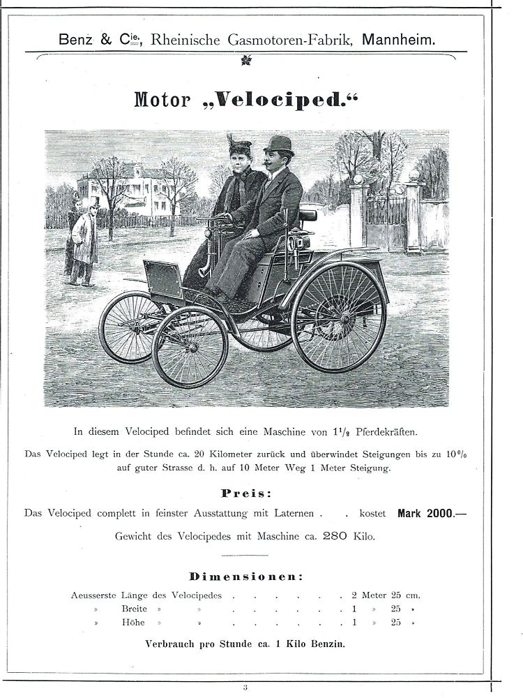 1894: Benz & Cie. präsentieren ein neues Modell, das erste für die Großserie vorgesehene kompakte Automobil. Ein zierliches, 280 Kilogramm leichtes Automobil mit liegendem Einzylindermotor von 1,1 kW/1,5 PS Leistung und damit der erste Kleinwagen. Zwei Jahre später heißt es im Verkaufskatalog zu Höchstgeschwindigkeit und Fahrverhalten: "Das Velociped legt in der Stunde ca. 20 Kilometer zurück und überwindet Steigungen bis zu 10 % auf guter Straße." Es kostet "complett in feinster Ausstattung mit Laternen" 2000 Mark