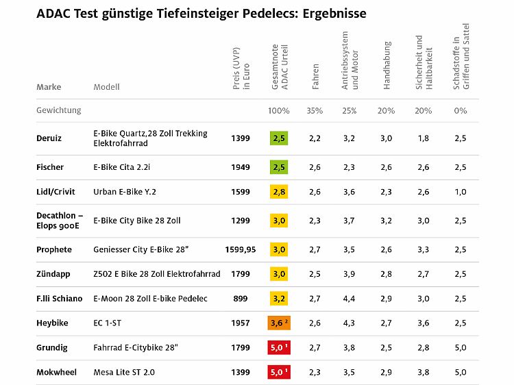 Fazit: Zwei Räder schneiden "gut" ab. Testsieger ist das "Deruiz E-Bike Quartz" für 1399 Euro (Note: 2,5). Der ADAC lobt seine leistungsfähigen Bremsen und die Prüfstandreichweite von 73 Kilometern. Die Schaltung harmoniere gut mit dem Antrieb. Ein Kritikpunkt sind die Unterstützungsmodi, die laut den Testern etwas feiner abgestuft sein könnten. Gleich bewertet - ebenfalls mit 2,5 - wurde das "Fischer E-Bike Cita 2.2i" für 1949 Euro.