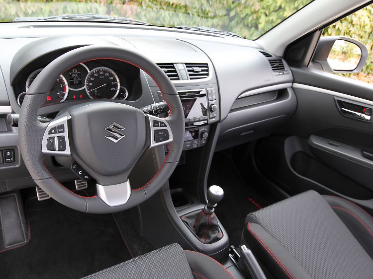 Befördert wird diese Vorstellung außer von den Sitzen auch noch von roten Ziernähten am Lenkradkranz, während die Cockpitgestaltung insgesamt eher lieblos wirkt. Unter der Prämisse, die Wettbewerber unterbieten zu wollen, wurde doch allzu häufig ins Kunststoffregal gegriffen, was zu einer uniformen Oberflächengestaltung führte. Obwohl bei bissigen Kleinwagen eher unüblich, kommt das helle Finish des Dachhimmels gut an, denn es verhindert eine allzu höhlenartige Atmosphäre im Innenraum. Dass der Transport von Gepäck nicht zu den Hauptaufgaben des Swift Sport gehört, ist nicht nur an der 80 Zentimeter hohen Ladekante zu erkennen, sondern auch an 211 Litern Gepäckvolumen, die mittels Umklappen der nicht teilbaren Rücksitzlehne auf 860 Liter erhöht werden können. Den entstehenden, etwa zwölf Zentimeter hohen Absatz in der Ladefläche muss man dann durch geschicktes Stapeln umgehen.