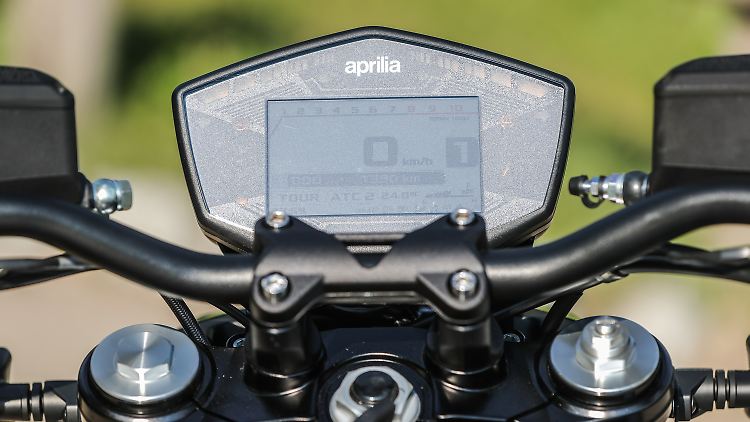 Angesichts des mit zehn Jahren doch recht langen Produktionszeitraums der 750er Shiver verwundert es nicht, dass außer der Traktionskontrolle noch deutlich mehr Elektronik Einzug gehalten hat. Unübersehbar wird das beim Blick auf das neue TFT-Display, dessen Ablesbarkeit insgesamt gut ist und dessen Informationsfülle absolut zufriedenstellt. Alleine der Balken-Drehzahlmesser erfordert sorgsames Hinsehen, um den momentanen Wert ablesen zu können. Stets bestens im Blick hat der Fahrer die Ganganzeige und die Einstellungen der Traktionskontrolle sowie des Motormappings; für dessen Veränderung genügt übrigens ein einziger Tastendruck.