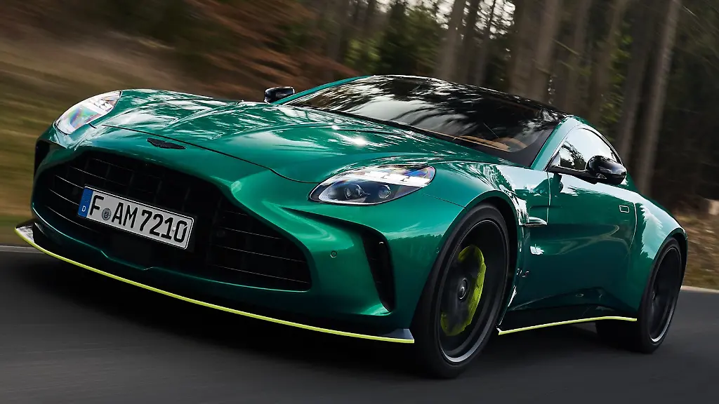 Schon im Stand ist klar: Alltagsheld will dieser Aston Martin nicht sein. Das metallisch schimmernde British Racing Green, die scharf geschnittenen Aerodynamikdetails und neonfarbene Akzente lassen das Coupé seit dem Facelift 2024 noch entschlossener auftreten. In einer Gegend, in der leistungsstarke Sportwagen zum Alltag gehören, zieht er durchaus Blicke auf sich.