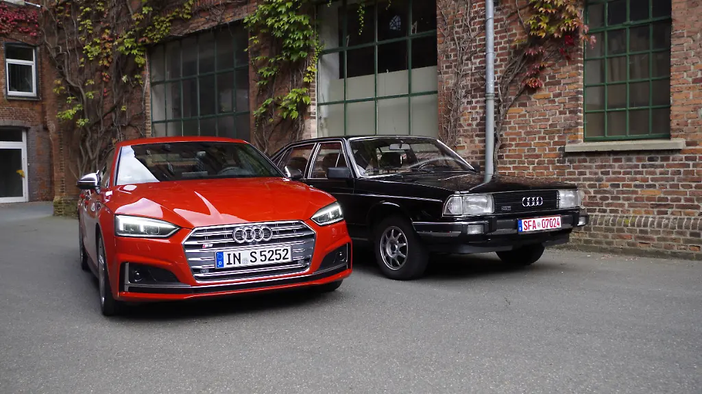 Vor 40 Jahren war der Audi 100 CD eine der sportlichsten Fahrzeuge auf deutschen Straßen. Heute muss sich der stattliche Oldtimer bereits mit einem Mittelklässler wie dem S5 messen lassen. Und dennoch geben die beiden ein hübsches Paar ab.