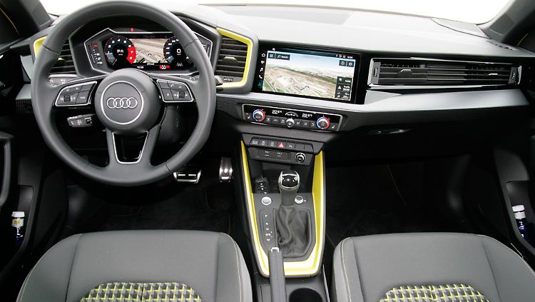 Diese Neugestaltung der Frontpartie hat der A1 dem Designer Jürgen Löffler zu verdanken, der auch für das sportliche Audi-Topmodell, den R8, verantwortlich zeichnet. Der stärkste Audi zeigt die gleichen Merkmale, einen tiefen Grill und die drei Schlitze. Größere Lufteinlässe am Bug sowie bis zu 18 Zoll große Felgen untermauern die dynamische Optik des A1. Nach Lesart des Herstellers ist die Gestaltung damit "maskuliner" geworden. An der Cockpitgestaltung fällt auf, dass die Mittelkonsole um 13 Grad zum Lenkplatz hin geneigt ist, das soll die Fahrerorientierung und die Ablesbarkeit der Informationen auf dem Monitor verstärken. An Verkleidungen und Einfassungen finden sich auf Wunsch Zitate der zehn verfügbaren Außenfarben wieder, gemeinsam mit der Auswahl an Kontrastlacken fürs Dach und Felgenoptionen nennt Audi eine Zahl von einer Million Kombinationsmöglichkeiten. An einer exzellenten Rundumsicht hindert lediglich die breite C-Säule.