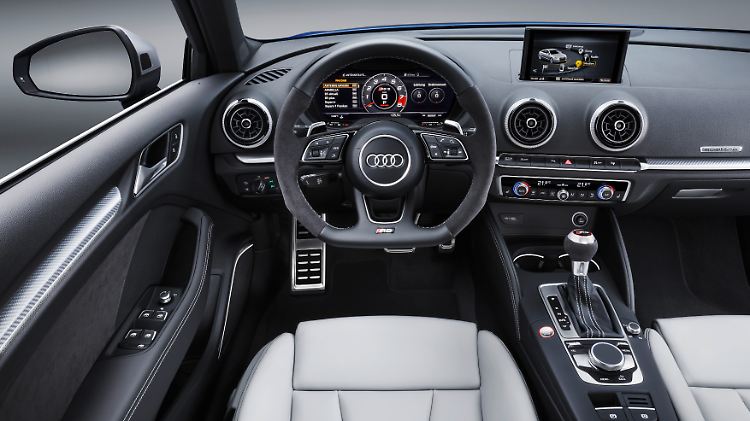 Äußerlich unterscheidet sich der RS 3 vom normalen A3 unter anderem durch eine modifizierte Front mit serienmäßigen LED-Scheinwerfern, Dachkantenspoiler und Diffusor sowie große ovale Endrohre. Der in dunklen Tönen gehaltene Innenraum empfängt Fahrer und Beifahrer mit beleuchteten Einstiegsleisten. Sportsitze in schwarzem Nappaleder mit RS-Logos in den Lehnen sind serienmäßig, ebenso wie der elektrisch ausfahrende 7-Zoll-Monitor. Das mittig positionierte Fahrerinformationssystem integriert Ladedruckanzeige, Ölthermometer und Laptimer.