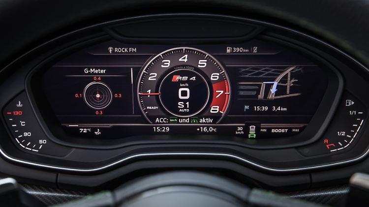 Besonders, wenn es kurvig wird. Durch die Rückbesinnung auf den kleinvolumigeren Turbo - bisher werkelte dort ein dicker Achtzylinder-Sauger - spart der Ingolstädter massiv Kilo auf der Vorderachse. 80 sind es insgesamt. "Wir wollten unsere Ikone so noch fahraktiver machen", sagt Audi-Sport-Chef Stephan Winkelmann. Hat funktioniert. Der Wagen ist enorm behände. Nach Deaktivieren der Stabilitätsprogramme zeigt der RS4 Avant im Dynamic-Modus erst recht, welche Gene er hat: Die Reifen auf den serienmäßigen 19-Zöllern halten den RS4 auch bei äußerst zügigem Anfahren souverän in den Kurven. Leichtes Schwänzeln fängt der Allradler auch ohne Rallye-Künste des Fahrers schnell wieder ein. Die Grenzen der Physik scheinen etwas verschoben, bis auf die ablesbaren G-Werte, die das Virtual Cockpit bei Bedarf einblendet.