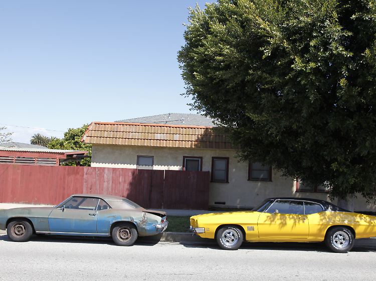 Da steht schon mal ein verbeulter Pontiac GTO vor einem bis an die Radmuttern gepflegten Chevrolet Camaro aus den 1970er Jahren. Da parken zwei Jeep CL wie Zwillinge hintereinander, die scheinbar nach der Geburt getrennt wurden. Ein Lowrider-Cadillac spreizt sich zwischen zwei Palmen oder ein heißer Käfer posiert vor einer kühlen Kachelwand, während ein mattgrauer Cadillac vor einem Spukschloss zu schlafen scheint; eine Stretchlimousine nimmt den Platz von zwei Häusern ein. Es sind Autogeschichten, die Tim Maxeiner in seinem Bildband "Auto – Allein zu Haus" erzählt. Geschichten, die sich manchmal ändern. Nämlich immer dann, wenn die Autos vor anderen Hintergründen auftauchen. Wie zum Beispiel der gestreckte Mercedes/8, der einmal vor einem schlichten grauen Wohnhaus und dann noch einmal vor einem blauen Flachbau zu sehen ist, der mindestens so viel Fenster hat wie der Benz. Auch der eben erwähnte Pontiac GTO taucht immer wieder auf. "Wie ein streunender Hund", bemerkt Maxeiner und fragt: "Wem gehört der bloß?"