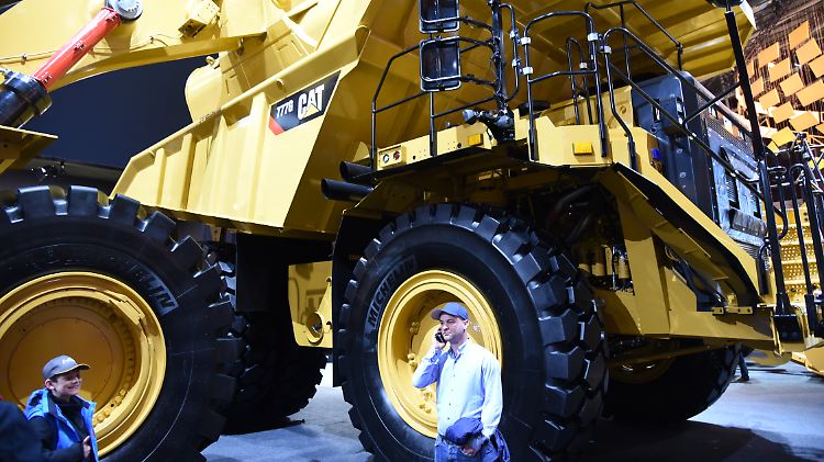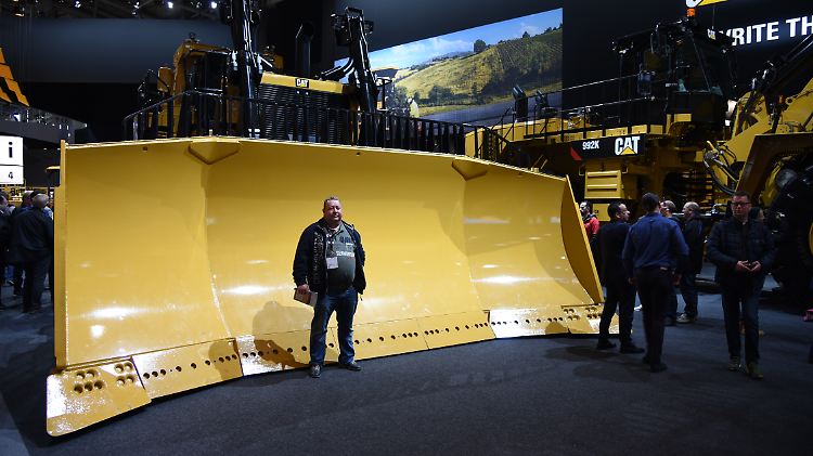 In Halle B6 parken die schweren Geräte von Caterpillar. Der große Muldenkipper 777G kann mit seinen 929 PS bis zu 100 Tonnen transportieren, wiegt insgesamt bis zu 182 Tonnen. Ein Monster von einem Lkw. Die große Raupe D11T mit ihrem 850 PS starken Diesel kommt auf ein Gewicht von 104 Tonnen. Die größte Schaufel mit bis zu drei Metern Höhe hat dabei ein Volumen von 43,6 Kubikmetern. Daneben wirkt der Radlader 972M mit einem Gesamtgewicht von immerhin 25 Tonnen nahezu zierlich.