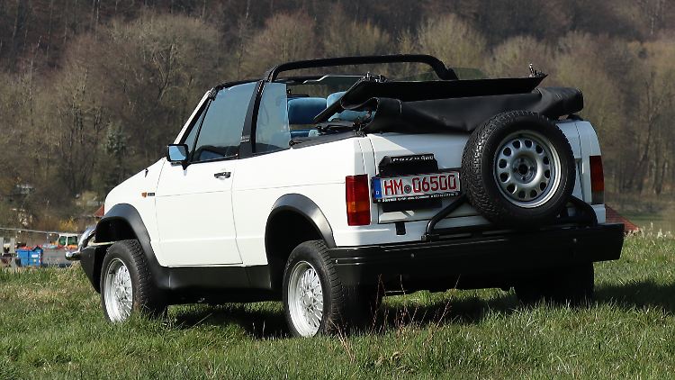 Während man davon innen noch einiges erkennt, ist außen vieles neu oder zumindest anders – und nicht immer VW. Denn die Karosseriebleche haben die Italiener nicht vom zweiten, sondern vom ersten Golf stibitzt. Im selbst gestalteten Kühler funzeln die Scheinwerfer des Fiat Panda, der auch seine Blinker spenden musste. Und links und rechts des außen angeschlagenen Ersatzrades schaut man auf die Rückleuchten der Opel Kadett Limousine. Dazu ein massiver Rammschutz, der aussieht als käme er vom Klempner statt vom Karosseriebauer, ein wuchtiger Überrollbügel zwischen der ersten und der zweiten Sitzreihe und ein Verdeck aus der Abteilung Pfadfinder-Zelte – fertig war ein Cabrio für Beach und Berge.