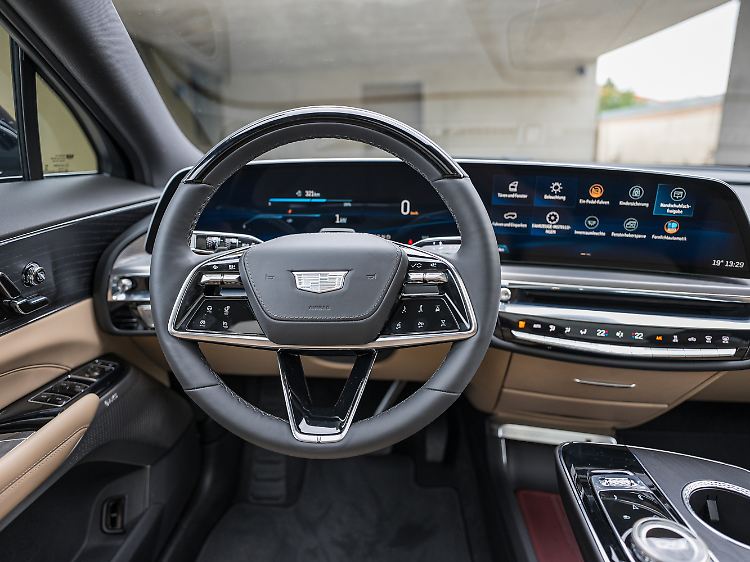 Der Spagat zwischen Tradition und Moderne gelingt noch besser im Innenraum. Cadillac integriert viele haptische Bedienelemente, ohne den Digitalfokus zu verlieren. Das erleichtert die Bedienung und stellt eine ansprechende Balance zwischen Hightech und klassischem amerikanischen Luxus her. Glänzende Metallteile mischen sich mit offenporigem Holz an den Türverkleidungen und der Mittelkonsole. Ein großes Ablagefach auf dem Boden zwischen Fahrer und Beifahrer ist für einen geschmackvollen Akzent mit hellblauem Leder ausgekleidet. Während sich die Insassen nicht über Platzmangel beschweren können, ist der Laderaum mit rund 590 Litern nicht so großzügig geschnitten wie in anderen SUVs, zudem verzichtet Cadillac auf einen Frunk.