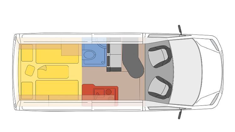 Der Grundriss birgt keine Überraschungen. Vorn die Sitzgruppe mit den Drehsesseln aus dem Fahrerhaus, ein erweiterbarer Tisch, Küchenblock mit Zwei-Platten-Kocher, Nasszelle mit Toilette und hinten ein längs angeordnetes Doppelbett. Dass dennoch vier Personen hier übernachten können, liegt an dem Doppelbett unter dem Aufstelldach. Auch eine Markise ist im Preis vom 58.500 Euro eingeschlossen. Mehr gibt es nicht. Weniger allerdings auch nicht – mit einer Ausnahme: Bei Verzicht auf das Aufstelldach wird es rund 2000 Euro preiswerter.