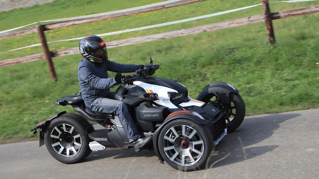 Mit dem starren Vorbau mit zwei Doppellenkern ist der Ryker kein Kurvenwedler, enge Kehren erfordern vom Fahrer tatkräftige Mitarbeit. Geht es einmal zu flott in die Kurve, unterstützt der Can-Am seinen Fahrer vor Kontrollverlust mit allerlei technischen Hilfsmitteln, Fahrzeugstabilisationssystem VSS genannt. Es besteht aus einer Kombination aus ABS, Traktionskontrolle und dem Stabilitätskontrollsystem SCS und wirkt direkt auf die Bremse und die Drosselklappe ein, wenn das Tempo zu schnell oder der Fahrer zu übermütig wird. Teilweise hat man sogar das Gefühlt, gegen das System arbeiten zu müssen, um schneller vorwärtszukommen. Gokart-Feeling kommt auch beim Fahrkomfort auf. Knackig ist das richtige Wort für die Dämpfung, die vor allem am hinteren, fast waagerecht eingebauten Federbein bei gröberem Geläuf und Schlaglöchern nur bedingt die Bandscheiben entlastet.