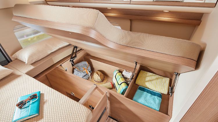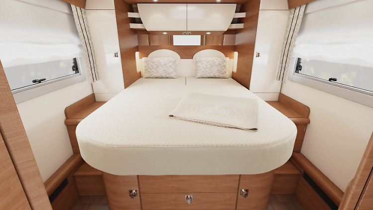 Zusätzlich entsteht mehr Arbeits- und Ablagefläche. Der Kleiderschrank findet sich stattdessen am Fußende unter dem Bett auf der Beifahrerseite und ist per Liftfunktion bequem von oben und vorn zugänglich.