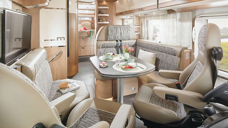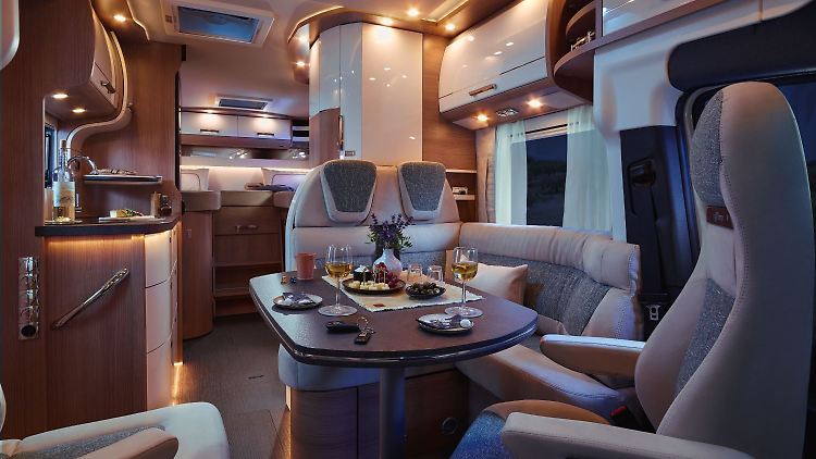 Da gibt es einen neuen PVC-Bodenbelag in Streifenoptik, auf Wunsch hellere Möbeldekore, weiße Dachschrankklappen und ein aufwändiges Lichtkonzept in drei Ebenen. Drei sinnvolle Details: Die Sitzbank verfügt über einen seitlich ausdrehbaren Schuhschrank, ein großer, 32-Zoll-LED-Bildschirm als Alternative zum serienmäßigen 24-Zöller versteckt sich in einem ausziehbaren Design-TV-Schrank und ein erhöhter Bar- und Küchentresen dient nicht nur der optischen Raumteilung, sondern fungiert auch als zusätzliche Ablage.