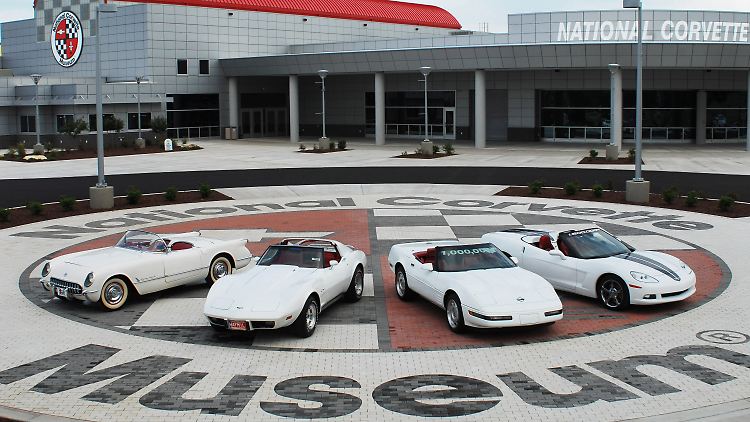 Die Corvette-Generationen 1, 3, 4 und 6 nebeneinander im National Corvette Museum.