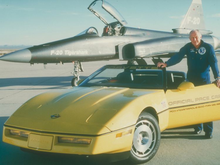 Die vierte Generation der Corvette wird auch von dem Überschallpiloten Chuck Yeager beworben. (Bild von 1986)