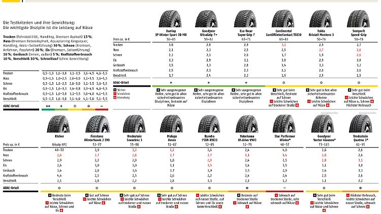 Ebenso wie bei den kleineren Reifen stehen auch hier zwei Produkte aus Fernost am Ende der Tabelle. Der Interstate Winter IWT-2 und Westlake SW 601 Snowmaster fielen beide durch ganz schwaches Abschneiden bei nassen Bedingungen auf. Der Bremsweg des Westlake war bei 100 km/h um 22 Meter länger als beim Klassenprimus. Beide entwickelten zudem eine recht laute Geräuschkulisse. Ein gutes Bild gab der Interstate lediglich beim Verschleiß ab. Der Westlake-Reifen holte die Bestwertung beim Kraftstoffverbrauch.