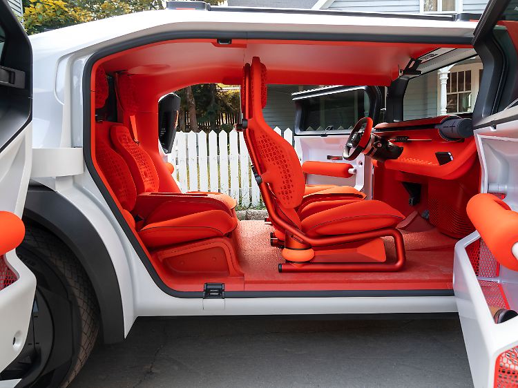 Stilelement wie die senkrecht stehende Windschutzscheibe oder die komplett waagrechte Haube dienen eher dem Blickfang. Die kantige Schräghecklimousine könnte aber vor allem bei der Materialwahl als Vorbild für die Serie dienen. Um Kosten und Gewicht zu sparen, haben die Franzosen Ladefläche, Dach und Hauben statt aus Stahl aus mit Waben verstärkter und mit Schutzlack überzogener Pappe gefertigt. Die Sitze stammen aus dem 3D-Drucker. Im Ergebnis kommt das kompakte E-Mobil auf ein Gewicht von nur 1000 Kilogramm - rund eine halbe Tonne weniger als konventionelle Autos dieser Größe.