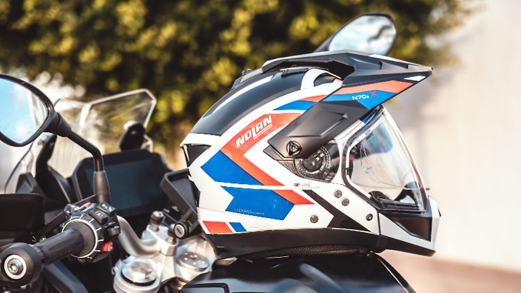 Mit dem neuen Helm N70-2X weitet Nolan sein Modularkonzept (das Kinnteil kann abgenommen werden) erstmals auf den Adventure-Bereich aus. Der mit einem großen Windschild sowie übergroßem Visier ausgestattete Helm eröffnet Reise-Enduristen viele Möglichkeiten: Er kann mit und ohne Visier sowie mit oder ohne Kinnteil gefahren werden. Weil Windschild und Visier nicht mehr auf derselben Bohrung befestigt sind, lässt sich auch der Windschild auf Wunsch demontieren. Einen Sonnenschutz gibt es dennoch, weil eine herunterklappbare Sonnenblende in die Helmschale integriert ist.
