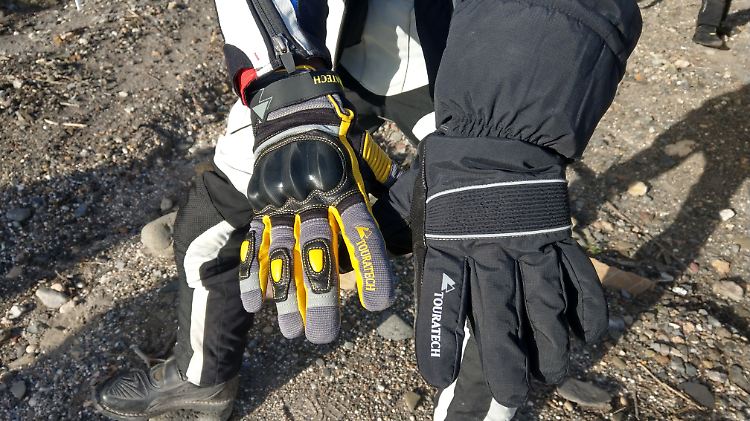 Wer auf längeren Reisen gelegentlich Schotter unter die Räder nehmen will, kennt das Problem der richtigen Handschuhwahl: Der Handschuh soll einerseits leicht und luftdurchlässig sein, bei Regen aber die Hände vor Nässe schützen.
