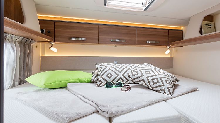 Im Heck laden zwei Einzelbetten zur nächtlichen Ruhe ein. Wer lieber kuscheln möchte, kann die beiden 1,88 Meter und 1,94 Meter langen Kojen mit einem Zwischenteil auch zu einer großen, fast zwei Meter breiten Liegewiese erweitern. Minuspunkt: Die Stauschränke über dem Kopfteil bergen die Gefahr unliebsamer Kollisionen. Zwei Kleiderschränke unter den Fußteilen der Betten bieten zwar reichlich Platz für Klamotten, unbequem wird es allerdings, wenn man in der Tiefe etwas suchen muss.