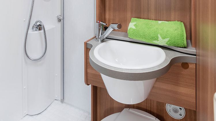 Das gegenüberliegende Bad ist zwar nicht groß, aber sehr zweckmäßig mit einem verschiebbaren Waschbecken, einer Keramik-Kassetten-Toilette und einer Dusche mit Falttür eingerichtet. Ein paar Haken für Waschlappen oder Handtücher wären allerdings wünschenswert.