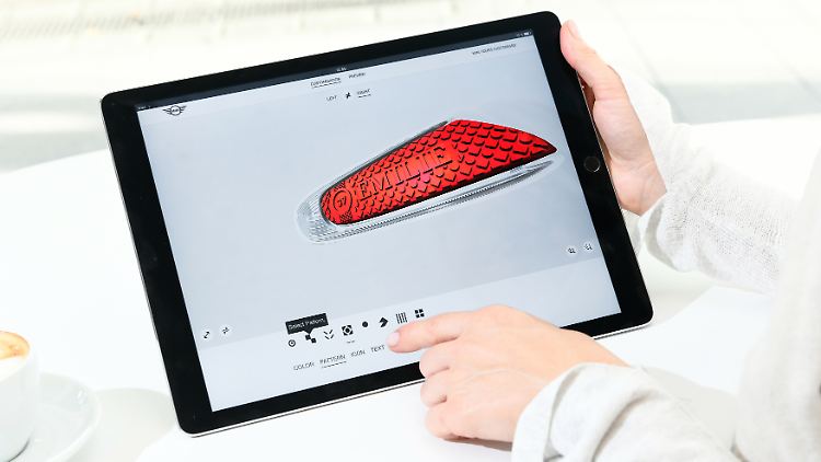 Dabei sind Strukturen und Muster im Maßstab variabel. Außerdem werden Designwelten rund um die Themen "Reiselust, Freizeit und Geschichte des Mini" aufgelistet. Aus diesen Themenfeldern ergeben sich abgestimmte Farben und Vorlagen sowie spezifische Icons. Auch sie lassen sich in ihrer Größe variieren und werden in einem vordefinierten Designfeld platziert. Darüber hinaus wird dem Nutzer ein Textfeld angeboten, dessen Größe und Position verändert und das mit einer entsprechenden Botschaft versehen werden kann. Ob das der Name des Mini, des Liebsten oder der Mutti ist, kann jeder selbst entscheiden.
