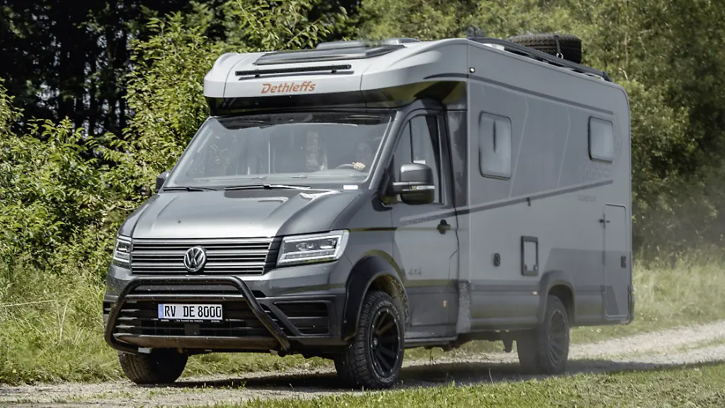 Der in Grau lackierte und auffällig beklebte Dethleffs-Allräder ist zwar mit einigen Offroad-Merkmalen ausgestattet wie 18-Zoll-All-Terrain-Reifen auf mattschwarz lackierten Felgen, LED-Lightbar, Schürzen, Markise sowie Leiter und Reling ebenfalls in Mattschwarz, wird von den Allgäuern aber bewusst nicht als Expeditionsmodell oder Hardcore-Offroader positioniert. Egal, ob Feldwege, sandige Strandzufahrten, geschotterte oder vereiste Hangwege, wichtig sei, dass man mit dem 4x4-Globebus auch schwer zugängliche Orte ohne Probleme erreichen könne.