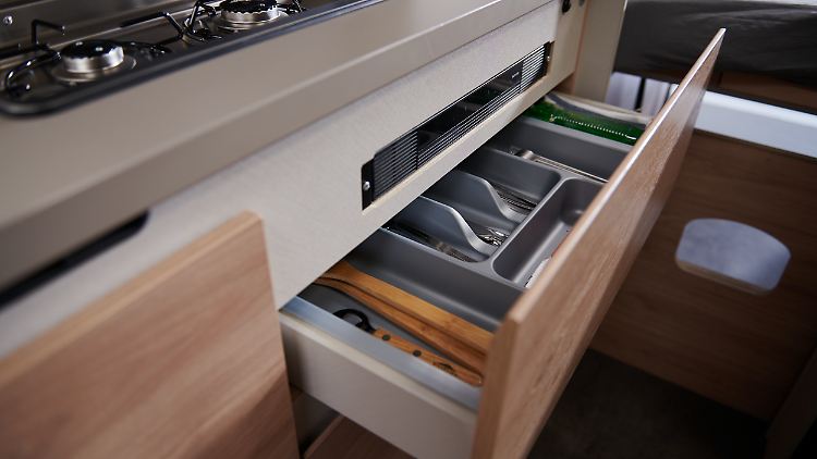 An Stauraum herrscht aber eh kein Mangel. Insgesamt zehn tiefe Oberschrank-Fächer stehen zur Verfügung. Zudem wurde der Platz im Sitzgruppen-Podest für zwei weitere Bodenfächer genutzt. Drei grifflose Schubladen in der Küchenzeile, die sich optional mit einer Zentralverriegelung verschließen lassen, nehmen Teller, Tassen, Töpfe und Pfannen auf. Der Kühlschrank an der Stirnseite hat zwar keinen Doppelanschlag, die größere 84-Liter-Variante ist aber auch so von innen und außen gleichermaßen gut erreichbar. Die 100-Liter-Frischwasser- und 90-Liter-Abwassertanks entsprechen den gängigen Dimensionen in dieser Klasse.