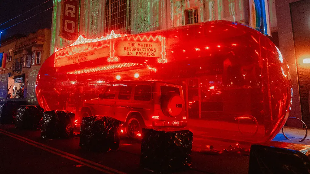 Neben der G-Klasse entscheiden in dem Fall jedoch in erster Linie unterschiedlich gefärbte Pillen darüber, ob man in der Matrix verbleibt (blau) oder sie verlässt (rot). Zur Filmpremiere am 18. Dezember in San Francisco gab es deshalb "Eskapismus extrem", denn in einer transparent-roten und 12 Meter langen Riesenpille steckte ein Mercedes-AMG G 63. Ein furioses Flucht-Fanal.