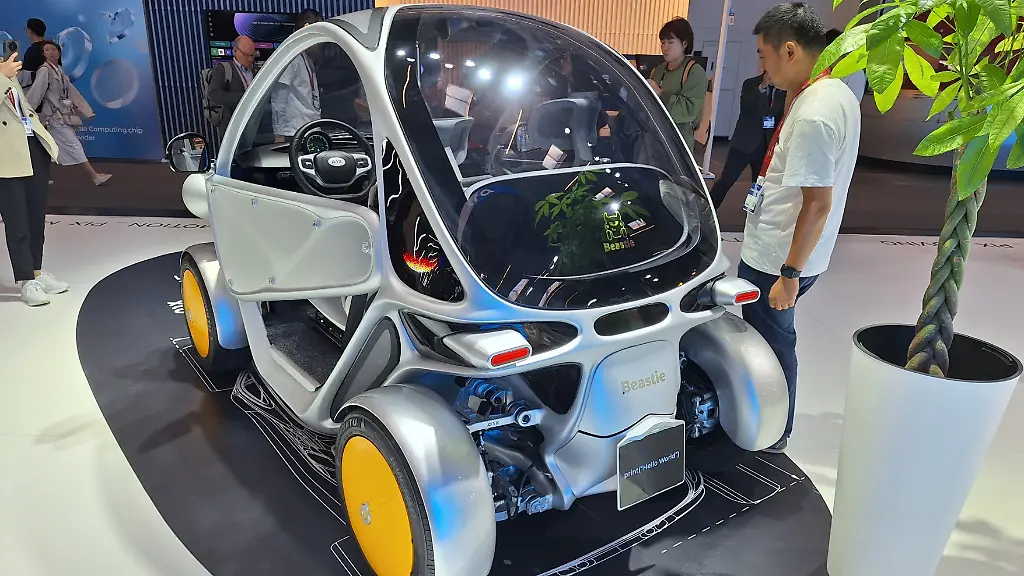 Immer mit Dach und immer mit vier Rädern ist ein "kleines Biest" aus China unterwegs. Die Firma Pix Moving hatte ihren kleine Cityflitzer namens Beastie nach München gebracht. Der ist mithilfe von KI und additiver Fertigung entstanden, quietschbunt, lustig anzusehen und weitestgehend individualisierbar. Das Mikro-Elektrofahrzeug mit dem 3D-gedruckten Chassis hat das Format des Ur-Smart, ist also 2,53 Meter lang, verfügt über zwei Sitze, Heckantrieb und ist bei einer Reichweite von bis zu 180 Kilometern maximal 90 km/h schnell. Die Kapazität des Akkus liegt bei 15 kWh.