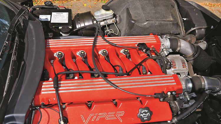 Die Viper ist wohl der einzige Supersportwagen, der von einem Lkw-Motor angetrieben wurde. Zumindest stammt die technische Basis des V10-Benziners aus dem Nutzfahrzeug-Regal, das Triebwerk wurde aber gemeinsam mit der damaligen Konzerntochter Lamborghini kräftig überarbeitet. Aus 8,0 Litern Hubraum schöpft der vorne eingebaute Sauger 405 PS und ein Drehmoment von 630 Newtonmeter, das via Sechsgang-Handschaltung an die Hinterachse geleitet wird - ungebändigt von ABS, Traktionskontrolle oder anderen elektrischen Helfern. Entsprechend schwierig zu fahren ist die tückische Giftschlange.