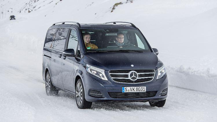 Den Anfang macht die V-Klasse. Erstaunlich souverän stürmt der Stuttgarter die verschneiten Serpentinen hoch. Sanft, fast unmerklich schaltet die 7-Gang-Automatik und verteilt die Elektronik die Kraft auf das Rad mit dem besten Grip. Das geht gut und trotz der üppigen 440 Newtonmeter Drehmoment dreht keines der Räder beim Aufstieg durch. Auch durch die spitzen Kurven lässt sich der Riese problemlos steuern. Auf den langen Anstiegen ohne Kurven beschleunigt der Stuttgarter Luxus-Van mühelos auf Tempo 100 und bremst genauso mühelos ab. Natürlich muss der Fahrer frühzeitig abbremsen, den Kurvenwinkel richtig einschätzen und den Blick am Kurvenausgang behalten. Doch ist er dort angekommen, darf er wieder beherzt aufs Gas treten und der Van schiebt sich weiter mühelos bis zum Scheitelpunkt.