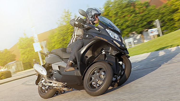 Ganz ähnlich sieht das bei dem entfernt mit dem MP3 verwandten QV3 der Schweizer Marke Quadro Vehicles aus. Hinter Quadro steckt der Zweiradtechnik-Zulieferer Marabese Design, der einst an der Entwicklung der Parallelogramm-Aufhängung der Vorderachse des ersten MP3 beteiligt war. Für die Quadro-Dreiräder hat Marabese später ein technisch feineres, hydraulisches Pendant zum MP3-System entwickelt und sich mit dem taiwanesischen Rollerhersteller Aeon zusammengetan, um 2012 zunächst das Modell 350D auf den Markt zu bringen.