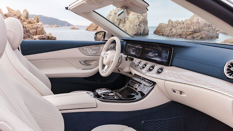 Anders als in der E-Klasse, aber genau wie beim Coupé, setzen neue Luftdüsen in der Armatur einen starken Akzent. Und tatsächlich hat man beim Blick auf die Luftausströmer das Gefühl, in ein Turbinentriebwerk zu schauen. Ein wirklich gelungenes Stück Design. Auf Wunsch sind - wie in den anderen E-Klasse-Modellen - zwei hochauflösende 12,3-Zoll-Displays verfügbar, die unter einem gemeinsamen Deckglas verschmelzen und zu einer Art "Widescreen" werden. Eine Kombination, die bis dato kein anderer Hersteller hat.