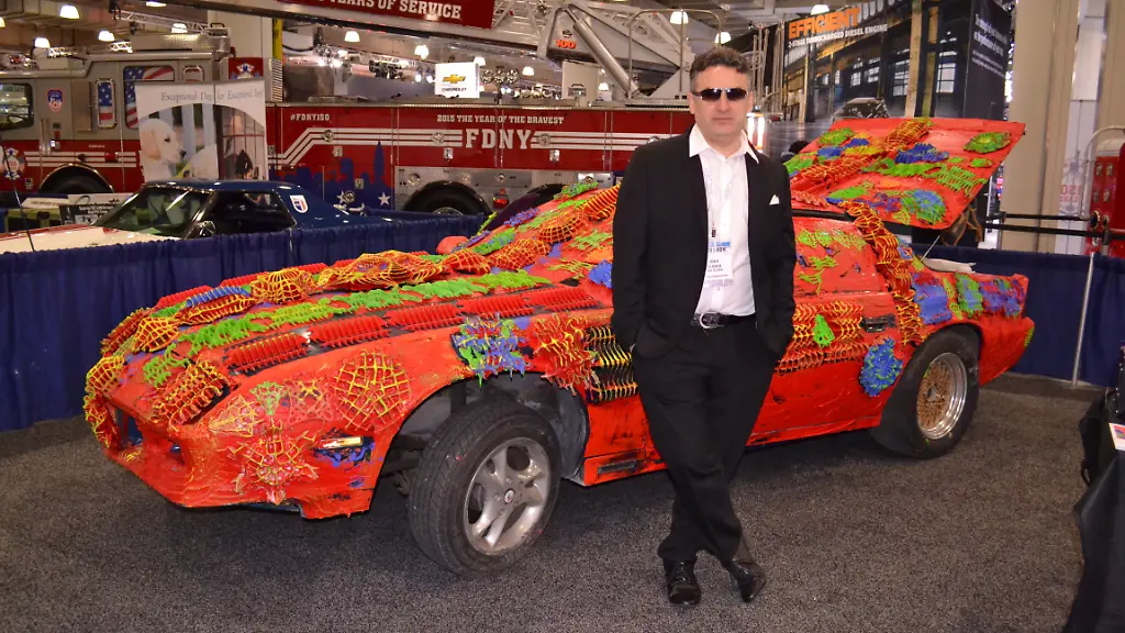 Irgendwo auf der untersten Etage der New York International Auto Show (NYIAS), dort wo die Feuerwehr und die New Yorker Polizei ihre historischen Fahrzeuge ausstellen, steht Ioan Florea vor einem Chevrolet Camaro, der aussieht, als wäre eine Kindergartengruppe in der Bastelstunde darübergefegt. Rot angepinselt und mit Dingen beklebt, die aussehen wie in der Mitte geteilte Girlanden. In den Katakomben, neben nicht ganz so strahlenden Neuerscheinungen fällt dieses bunte Etwas im Javits Center besonders auf.