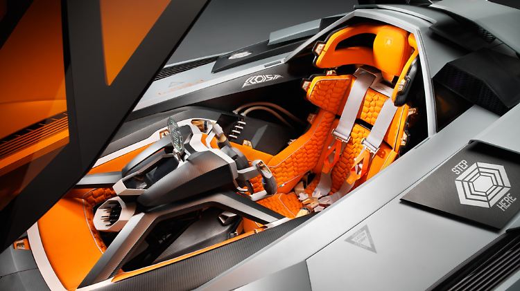 Dafür hat es der Platz des Fahrers in sich: Der ist angelehnt an die Pilotenkabine eines amerikanischen Apache-Kampfhubschraubers, heißt es. Mit Head-Up-Display und Vierpunktgurt darf man sich hier fühlen wie ein Top-Gun-Jetpilot. Beim Ein- und Ausstieg muss das Lenkrad entfernen und auf dem Armaturenbrett ablegt werden, während die orangefarben getönte Kuppel elektrisch öffnet. Mit den Füßen steigt man auf den Sitz, um auf der linken Karosserieseite auf eine entsprechend präparierte Stelle zu treten, und nach einer Drehung um 180 Grad, den Sprung vom Fahrzeug zu wagen.