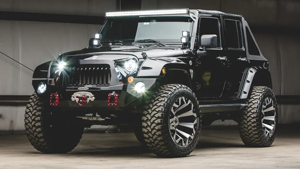 Denn natürlich hat das aufgemotzte Ami-Urgestein mehr zu bieten als ein schnöder Wrangler vom Band. Vorn soll eine Seilwinde von Smittybilt den Karren bei Bedarf aus dem Dreck ziehen. Die Stoßfänger wurden vorn mit zwei roten Schlepphaken verziert und die vom Sondermodell 10th Anniversary stammende Motorhaube hat eine neue Lackierung bekommen. Die Kotflügelverbreiterungen sollen im Übrigen nicht nur den Charakter des Kraxlers verstärken, sondern auch das entsprechende Dach für die mächtigen 22-Zoll-Felgen bieten, die mit Offroad-Reifen von Repulsor im Format 37 x 13,50 R 22 LT bespannt sind.