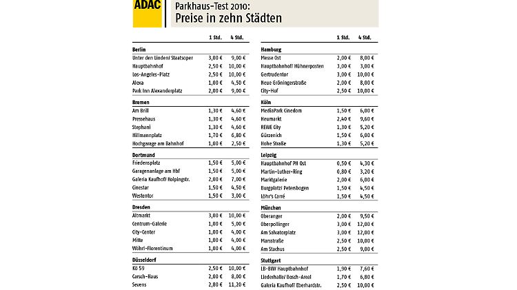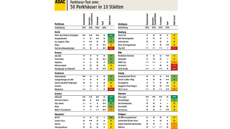 Testsieger ist das Parkhaus Oberanger in München, das die Prüfer in nahezu jeder Hinsicht überzeugte. Es ist großzügig und übersichtlich angelegt, die Fußgängerwege sind deutlich gekennzeichnet. Sensible Bereiche haben eine Video-Überwachung. Einmalig sind die Extra-Parkplätze für Senioren. Schlusslicht ist der City-Hof am Hamburger Klosterwall. Dunkel, verwinkelt und ungepflegt präsentiert sich das Gebäude mit viel zu engen Parkplätzen.