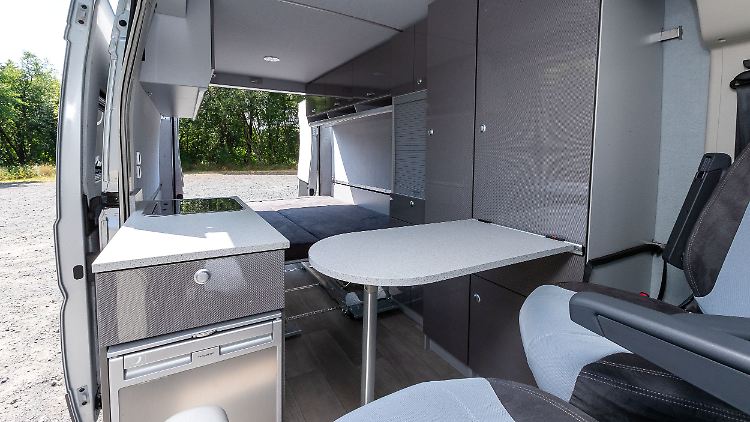 Bis zu vier Personen können ein Nickerchen machen, dazu gibt es neben der Bank auf dem Ladeboden auch unter dem Hochdach eine Nische mit Auslegeware, die man per einschiebbarer Leiter erklimmt. Praktische Fliegennetze halten unliebsame Gäste aus dem Fahrgastraum fern. Darüber hinaus sorgen Gaskocher, Kanister-Wasseranlage mit 20 Liter Abwasser-Kapazität und integrierter Markise für adäquate Camping-Ausstattung. Eine Standheizung ist ebenso serienmäßig wie komplett drehbare Vordersitze für einen gemütlichen Abend.