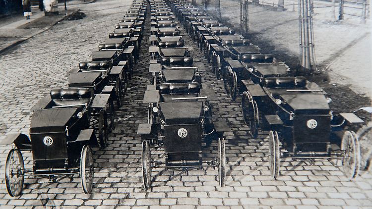Eine undatierte historische Aufnahme zeigt Slaby-Beringer SB-Elektrowagen, die zur Auslieferung bereit stehen.