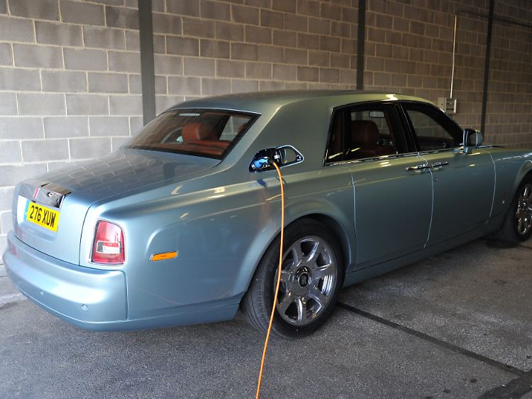 Egal wie gut man rekuperiert - irgendwann muss der 102 EX an die Steckdose. Und zwar ziemlich lange. Weil viele Akkus auch viel Zeit zum Laden brauchen, hängt er selbst bei Starkstromversorgung acht Stunden am Netz. An der normalen Haushaltssteckdose dauert die Ladung sogar 20 Stunden. Aber immerhin: Damit niemand im Smoking strippen ziehen muss, hat Projektleiter Hall dem Phantom auch eine Induktionsplatte unter den Wagenboden geschraubt, die funktioniert wie die Ladestation einer elektrischen Zahnbürste: Kaum parkt der Phantom über dem entsprechenden Gegenstück im Asphalt und autorisiert sich über eine Bluetooth-Verbindung, fließt der Strom auch ohne Kabel.