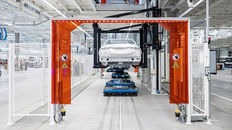 Statt auf Fließbändern werden die Karosserien auf führerlosen Transportschlitten durch die Produktionshallen gefahren.