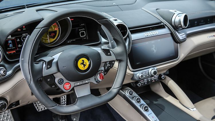 Fangen wir mit den vier Sitzen an: Ja, der GTC4 hat vier Sessel, aber auf längeren Fahrten will man die Plätze im Fond guten Freunden nicht anbieten – auch wenn sie dank des riesigen Panoramadachs einen wunderbaren Ausblick haben. Vorne ist es deutlich geräumiger und selbst mit über 1,90 Meter Körperlänge findet man ordentlich Platz. Während viele Sportwagen auf eine rigorose Fahrerkonzentrierung setzen, kümmern sich die Italiener auch um den Beifahrer, auf Wunsch hat der Sozius einen breiten Touchscreen vor sich, über den er unter anderem das Navigations- und Entertainmentsystem ansprechen kann. Ein weiteres, über 10 Zoll großes Display in der Mittelkonsole bietet zeitgemäßes Infotainment – inklusive Apple-Car-Play-Funktion.