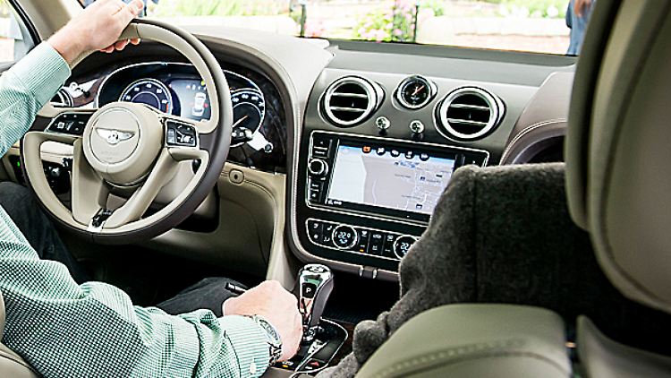 Die Cockpitgestaltung greift das Thema der ausgebreiteten Flügel erneut auf, das sich seit Erfindung des Markenlogos durch die Bentley-Jahrzehnte zieht. Fahr- Assistenz-, Komfort- und Entertainment-Funktionen können wahlweise per Drehdrück-Steller oder Touchscreen orchestriert werden. Fahrwerkmodi und die Anpassung des Allradantriebs an verschiedene Untergründe sind in einem Zentralschalter auf der Mittelkonsole zusammen gefasst. Die symmetrische Aufteilung, darauf weist Interieur-Designer Darren Day besonders gern hin, erlaubt es, sowohl für Rechts- als auch für Linkslenker den gleichen Abstand des Getriebehebels zum Lenkrad zu realisieren. Sein wichtigstes Gestaltungs-Thema heißt "Präzision", nicht ohne Stolz weist er darauf hin, dass Schalter und Knöpfe mit einer Fugentoleranz bis hinab zu 0,3 Millimetern eingepasst wurden.