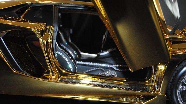 Ein vergoldeter Lamborghini Aventador, geschmückt mit Edelsteinen, macht auf seiner Welt-Tour gerade Zwischenstopp in der größten Stadt der Vereinigten Arabischen Emirate. Er wird jedoch nicht gefahren, sondern steht gut geschützt in einer Vitrine aus Panzerglas. Der Aventador hat nämlich keinen Zwölfzylinder und keine 700 PS, sondern ist eine Miniatur im Maßstab 1:8. Seine Karosserie ist nur knapp 60 Zentimeter lang.