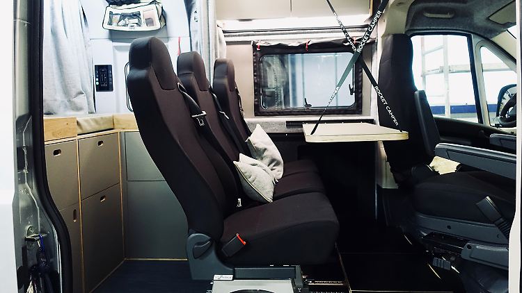 Die bisherige Sechs-Meter-Variante wird nun ergänzt durch eine 6,36 Meter lange XL-Version mit Längs-Einzelbetten im Heck. Aber auch hier montiert das noch junge Unternehmen aus Stuttgart in der zweiten Reihe drei Einzelsitze, alle mit Isofix-Befestigung, und dahinter eine großzügige Querküche über die gesamte Wagenbreite. Eine 5,40 Meter kurze S-Version für zwei Personen ohne die Dreierreihe in der Mitte, aber ansonsten mit den gleichen Möbelmodulen und Querbett hinten ist für Mitte des Jahres geplant.