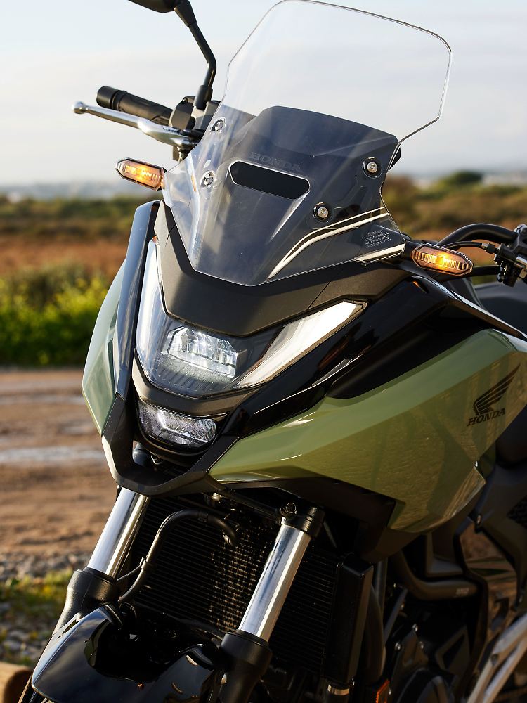 Mit dem neuen Design der Frontleuchten bietet die Honda NX750 eine markante Lichtgrafik.