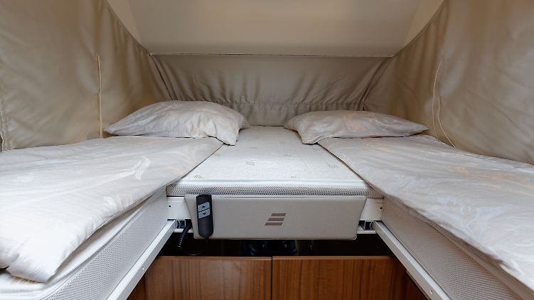Verwirklicht wird das Ganze auf noch gut zu handhabenden sieben Metern Außenlänge. Das Hymer Duo-Mobil B-DL 534 baut auf der B-Klasse Dynamic-Line auf und wiegt dank einer neuen Möbelgeneration und weiteren Leichtbaumaßnahmen im fahrbereiten Zustand 2980 Kilogramm, so dass selbst mit einer gehobenen Ausstattung und zwei Reisenden an Bord noch eine ordentliche Zuladungsreserve von rund 300 Kilogramm verfügbar sein sollte. Die beiden Einzelkojen werden als Hubbett über dem Fiat-Ducato-Fahrerhaus herabgelassen und sind dann über eine Drei-Stufen-Leiter leicht zu erreichen. Genau genommen handelt es sich hier sogar um ein Multifunktionsbett mit einer quer liegenden 1,90 Meter langen und 1,50 Meter breiten Matratze, die auch als Doppelbett genutzt werden kann. Zwei Verlängerungspolster an den beiden Fußenden ergeben dann aber die gewünschte Einzelbettkonfiguration.